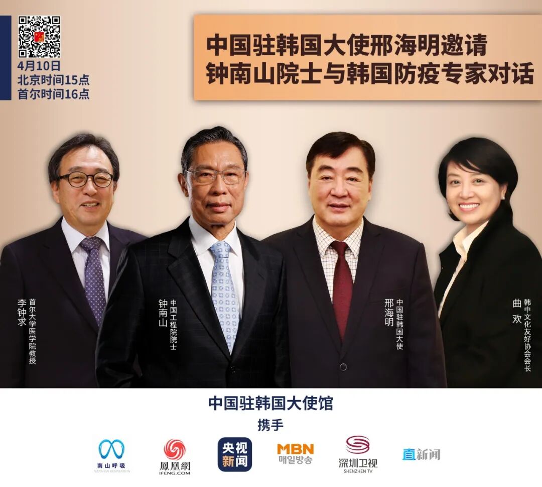 北京时间4月10日15时(首尔时间16时),邢海明大使将做客央视新闻《共同战“疫”》直播间,邀请中国工程院院士、新冠病毒联防联控工作机制科研攻关组组长钟南山和韩国国立首尔大学医学院教授、前保健福祉部疾病管理本部长李钟求对话连线,就全球疫情形势、中韩抗疫经验等在线交流。中国驻韩国大使馆携手央视新闻、韩国MBN电视台等国际传播平台同步网络直播,敬请关注。